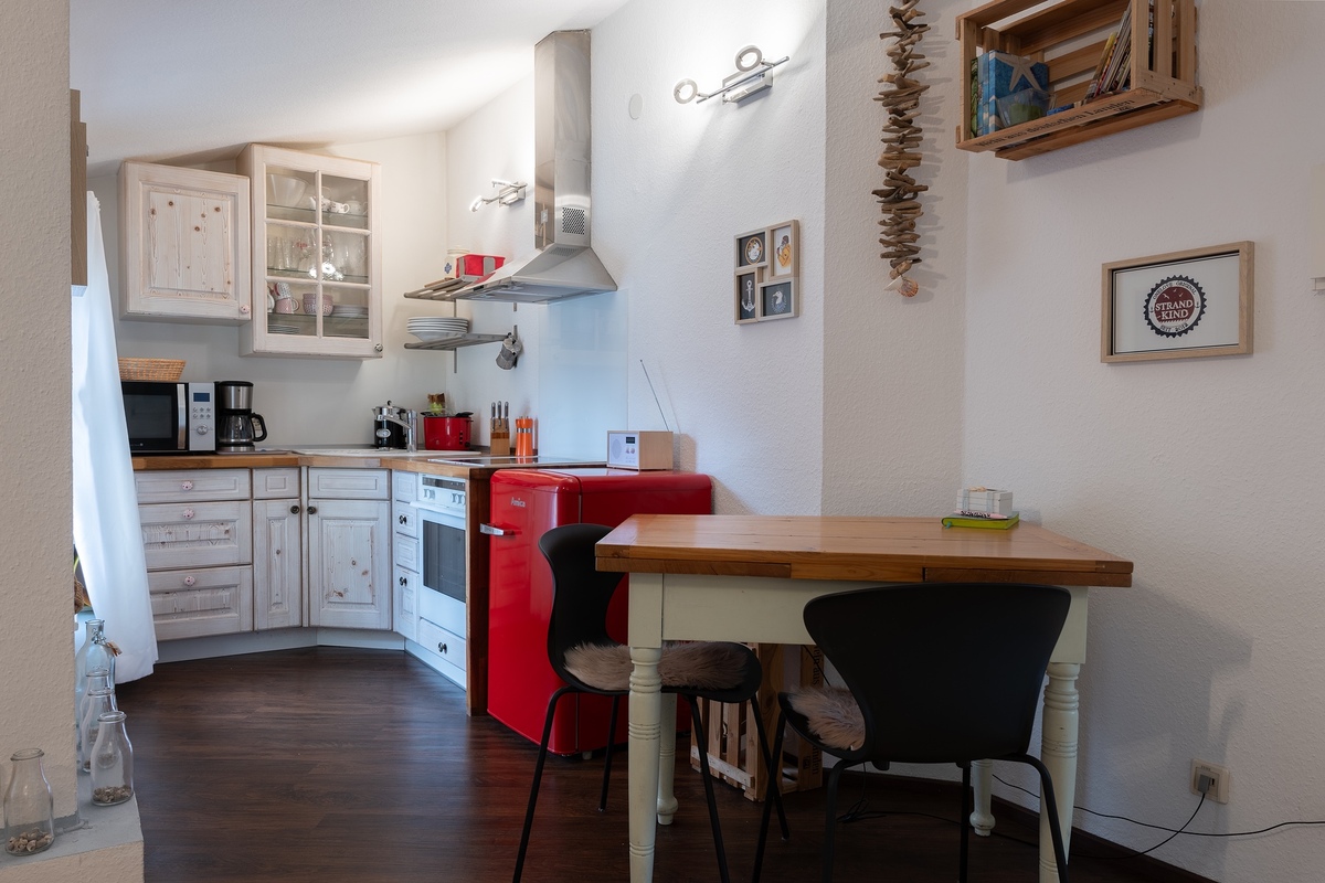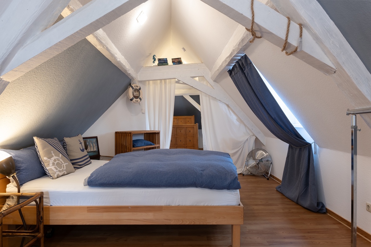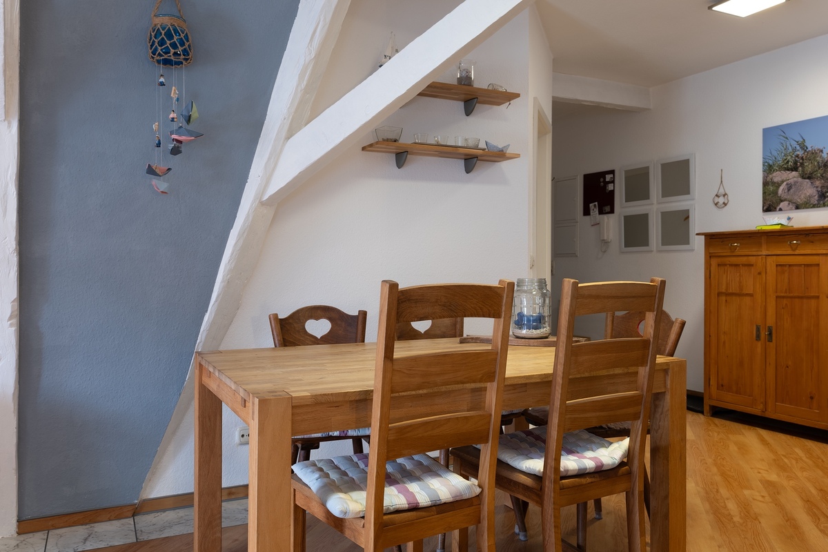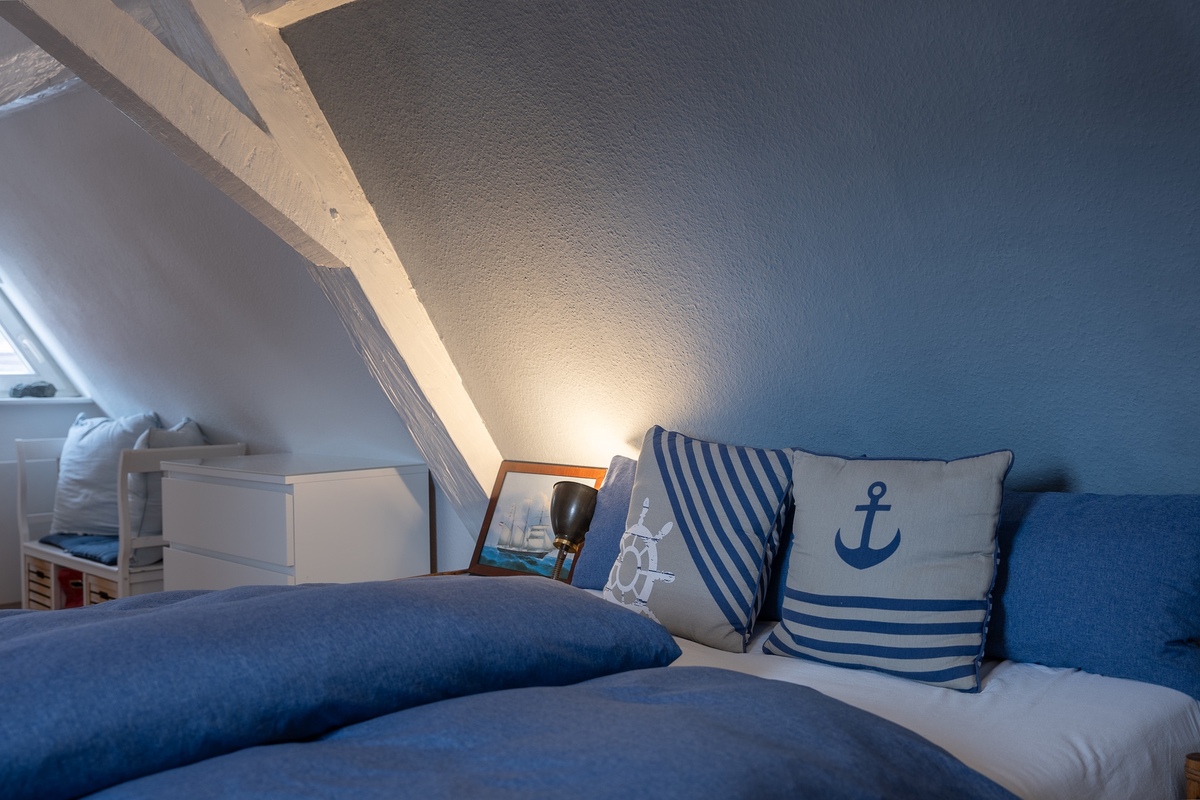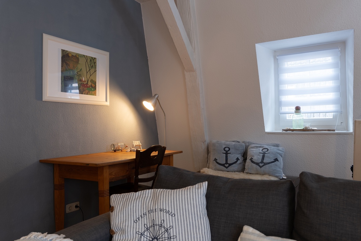 Hier muss das Herz entscheiden, ob der Blick nach draußen oder die maritime Einrichtung die Seele mehr berührt. Durch den großzügigen Schnitt der Wohnung fühlt sich jeder sofort eingeladen wie zuhause. Mit einem Schoppen Wein, den Sie gerne bei Ihrem Gastgeber erwerben können, lassen Sie den Abend mit Blick auf die Katharinenkirche oder in unserem mediterranen Innenhof ausklingen.